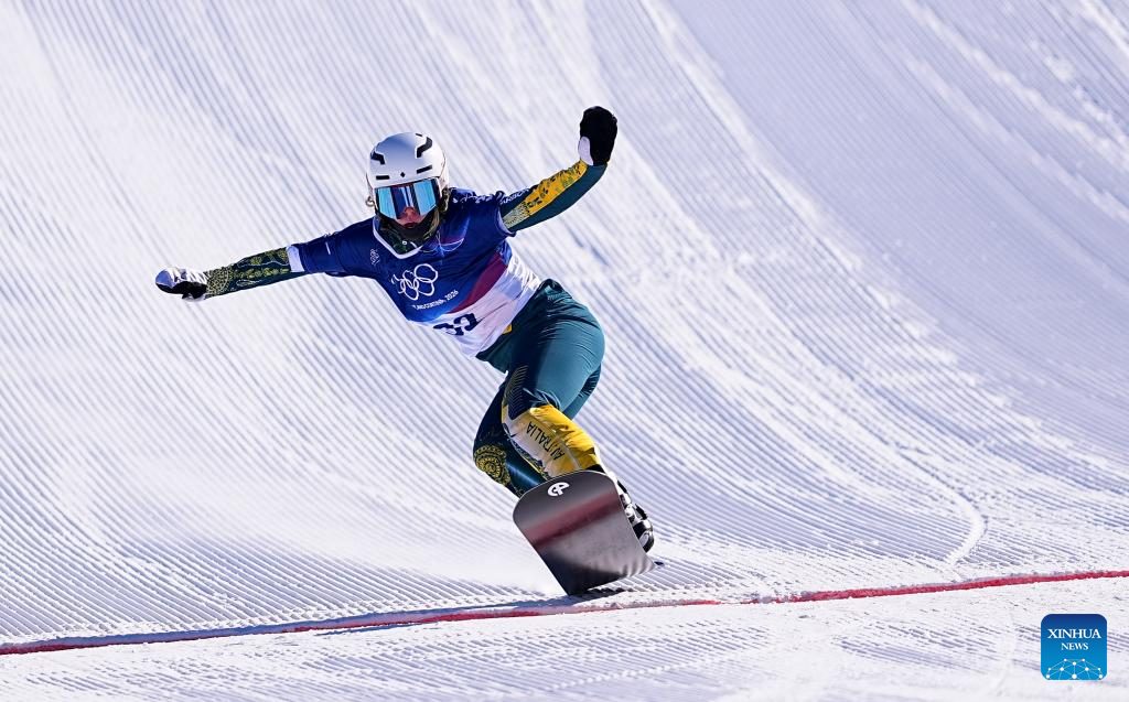 Abbey Wilson of Australia competes during the snowboard women's cross seeding at the Milan-Cortina 2026 Olympic Winter Games in Livigno, Italy, Feb. 13, 2026. (Xinhua/Wu Huiwo)