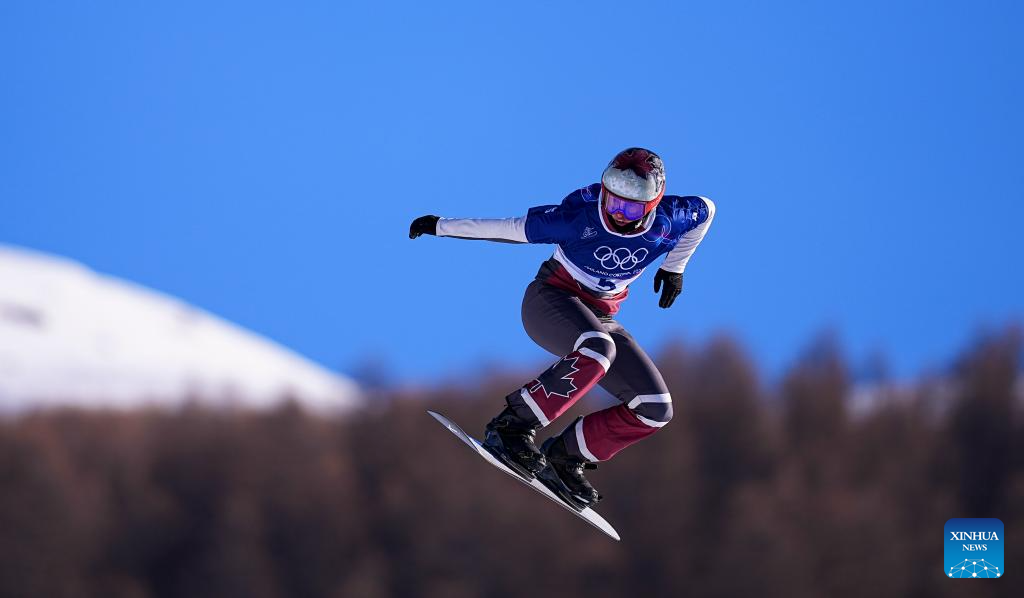 Audrey McManiman of Canada competes during the snowboard women's cross seeding at the Milan-Cortina 2026 Olympic Winter Games in Livigno, Italy, Feb. 13, 2026. (Xinhua/Wu Huiwo)