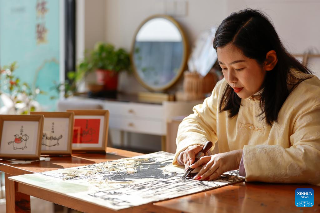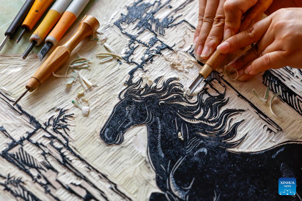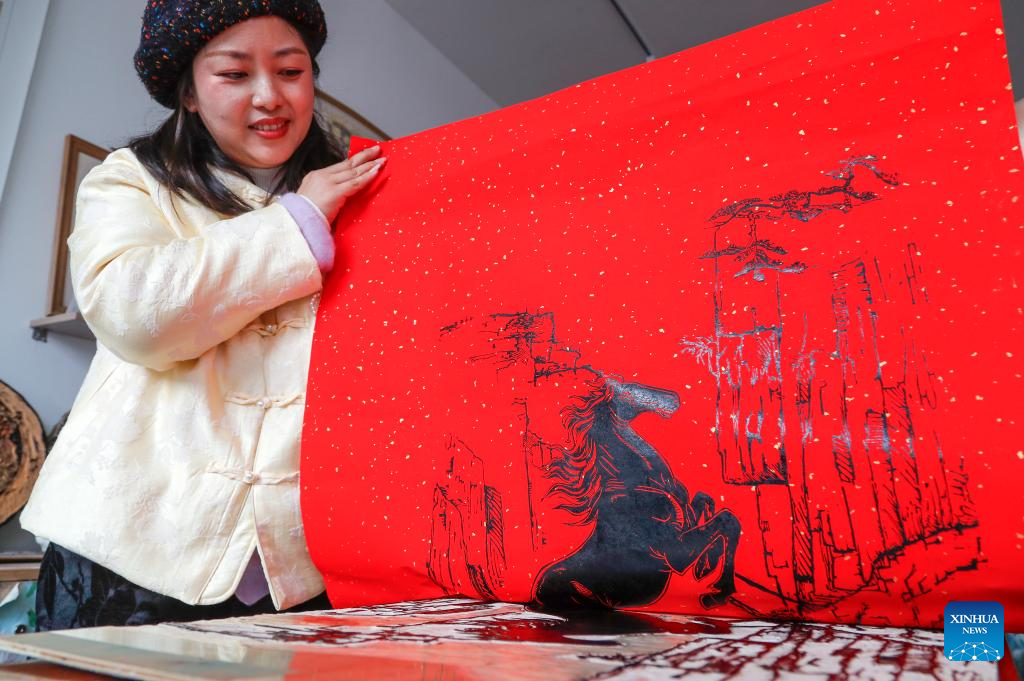 This year's Spring Festival marks the beginning of the Year of the Horse. With the vivid horse designs, the ingeniously crafted Huizhou woodblock print, a provincial-level intangible cultural heritage, adds an enduring charm to the authentic Chinese aesthetics. (Photo by Shi Yalei/Xinhua)