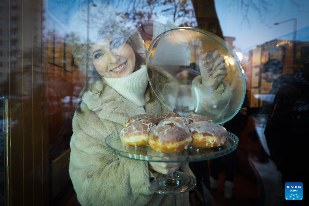 A woman displays traditional doughnuts in a shop window in Warsaw, Poland on Feb. 12, 2026. People in Poland eat traditional doughnuts on Fat Thursday to mark the last Thursday before the start of Lent. (Photo by Jaap Arriens/Xinhua)