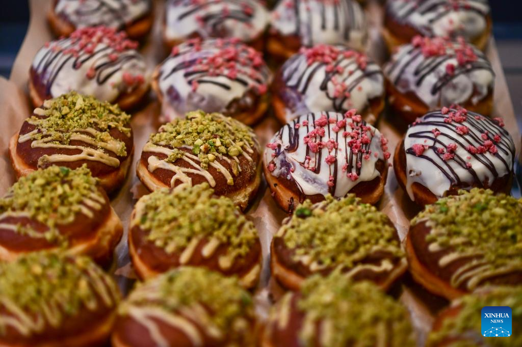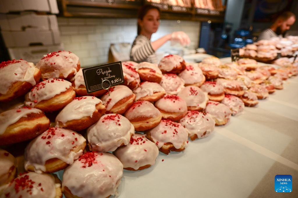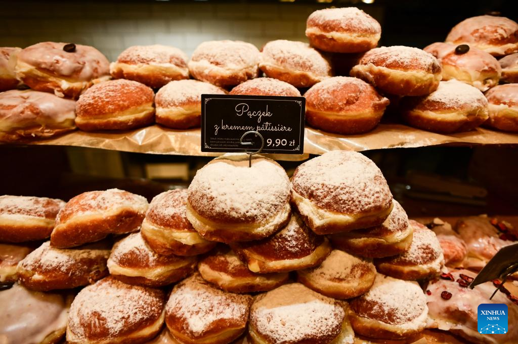 Assorted doughnuts are displayed at a pastry shop in Warsaw, Poland on Feb. 12, 2026. People in Poland eat traditional doughnuts on Fat Thursday to mark the last Thursday before the start of Lent. (Photo by Aleksy Witwicki/Xinhua)
