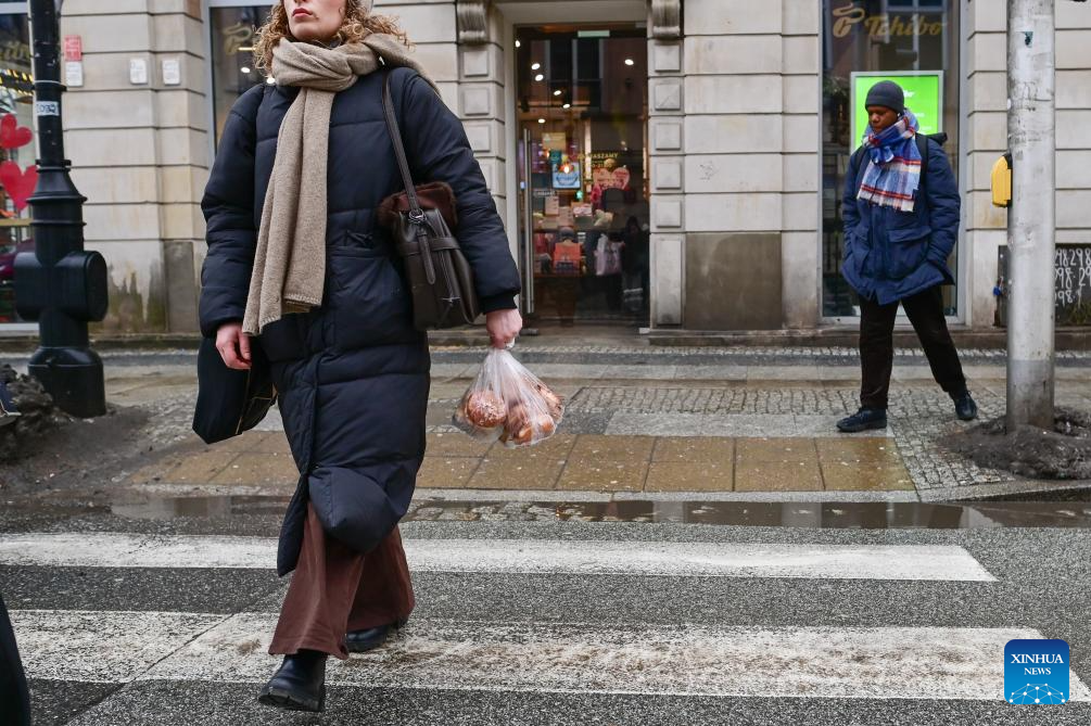 A woman carries traditional doughnuts on a street in Warsaw, Poland on Feb. 12, 2026. People in Poland eat traditional doughnuts on Fat Thursday to mark the last Thursday before the start of Lent. (Photo by Aleksy Witwicki/Xinhua)