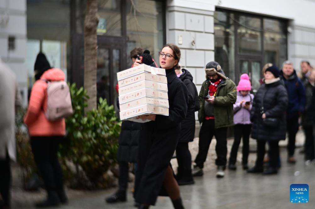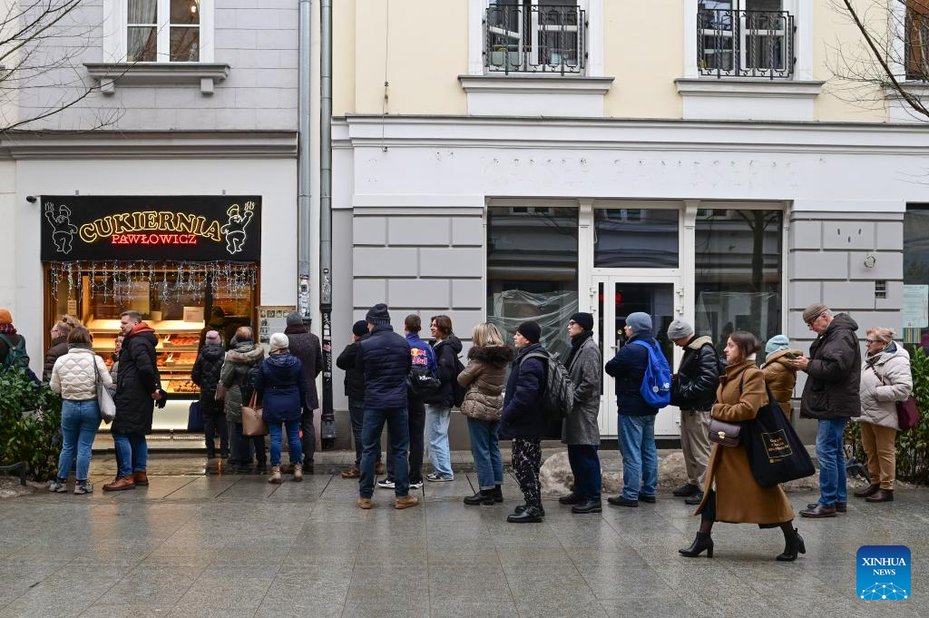 People queue outside a pastry shop to buy doughnuts in Warsaw, Poland on Feb. 12, 2026. People in Poland eat traditional doughnuts on Fat Thursday to mark the last Thursday before the start of Lent. (Photo by Aleksy Witwicki/Xinhua)