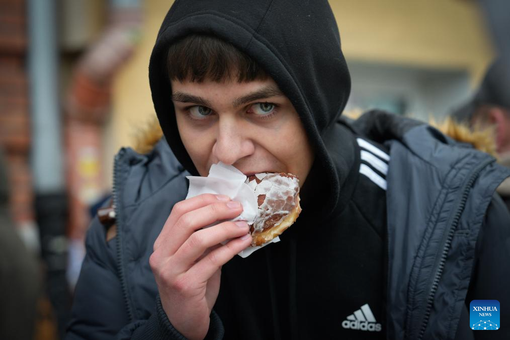A man eats a traditional doughnut in Warsaw, Poland on Feb. 12, 2026. People in Poland eat traditional doughnuts on Fat Thursday to mark the last Thursday before the start of Lent. (Photo by Jaap Arriens/Xinhua)