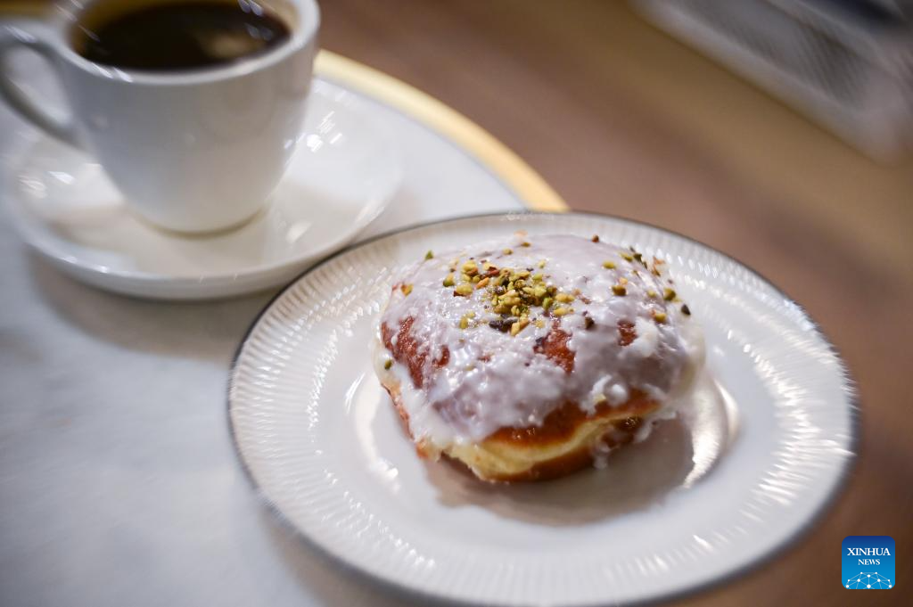Photo taken on Feb. 12, 2026 shows a doughnut and a cup of coffee on a table in Warsaw, Poland. People in Poland eat traditional doughnuts on Fat Thursday to mark the last Thursday before the start of Lent. (Photo by Aleksy Witwicki/Xinhua)