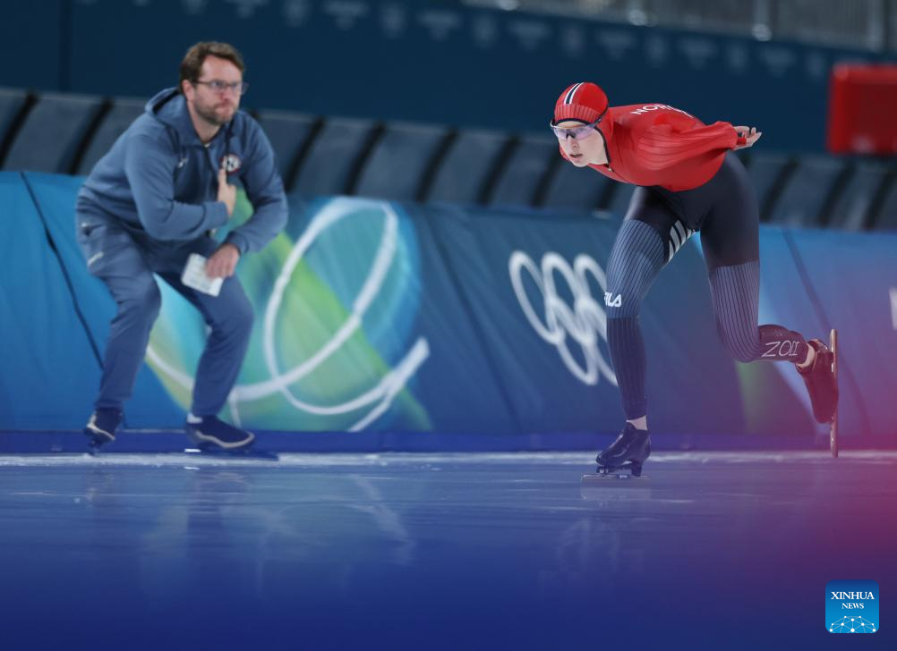Ragne Wiklund of Norway competes during the speed skating women's 5000m final at the Milan-Cortina 2026 Olympic Winter Games in Milan, Italy, Feb. 12, 2026. (Xinhua/Li Jing)