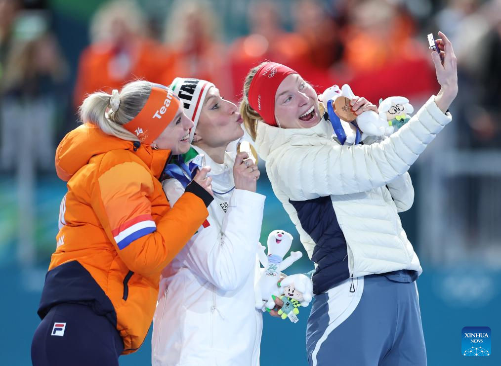 Gold medalist Francesca Lollobrigida (C) of Italy, silver medalist Merel Conijn (L) of the Netherlands and bronze medalist Ragne Wiklund of Norway take a selfie during the awarding ceremony of the speed skating women's 5000m final at the Milan-Cortina 2026 Olympic Winter Games in Milan, Italy, Feb. 12, 2026. (Xinhua/Li Jing)
