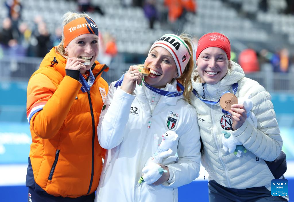Gold medalist Francesca Lollobrigida (C) of Italy, silver medalist Merel Conijn (L) of the Netherlands and bronze medalist Ragne Wiklund of Norway pose for a photo during the awarding ceremony of the speed skating women's 5000m final at the Milan-Cortina 2026 Olympic Winter Games in Milan, Italy, Feb. 12, 2026. (Xinhua/Li Jing)