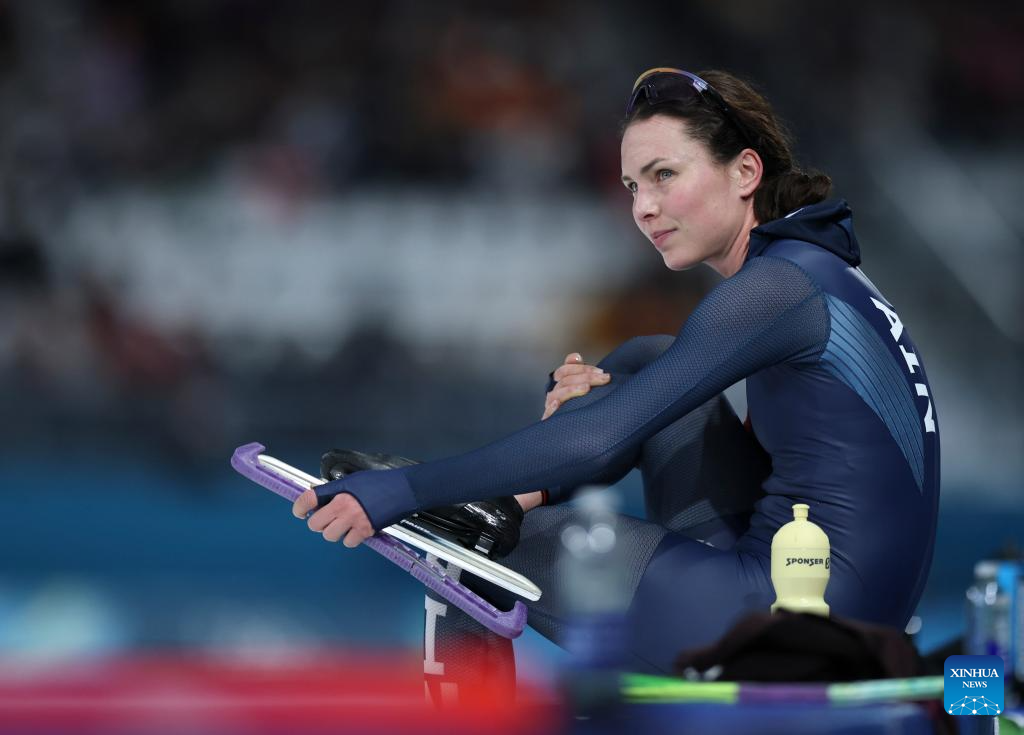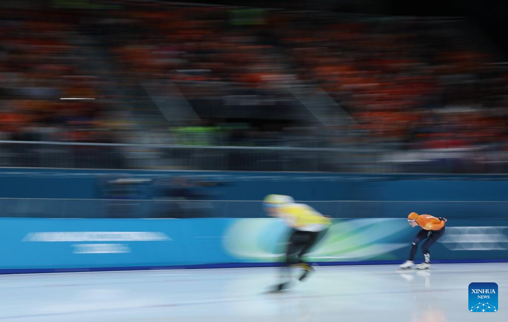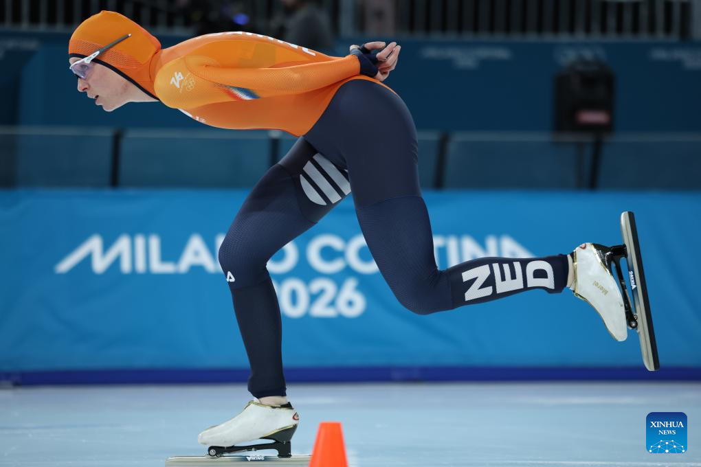 Merel Conijn of the Netherlands competes during the speed skating women's 5000m final at the Milan-Cortina 2026 Olympic Winter Games in Milan, Italy, Feb. 12, 2026. (Xinhua/Li Jing)