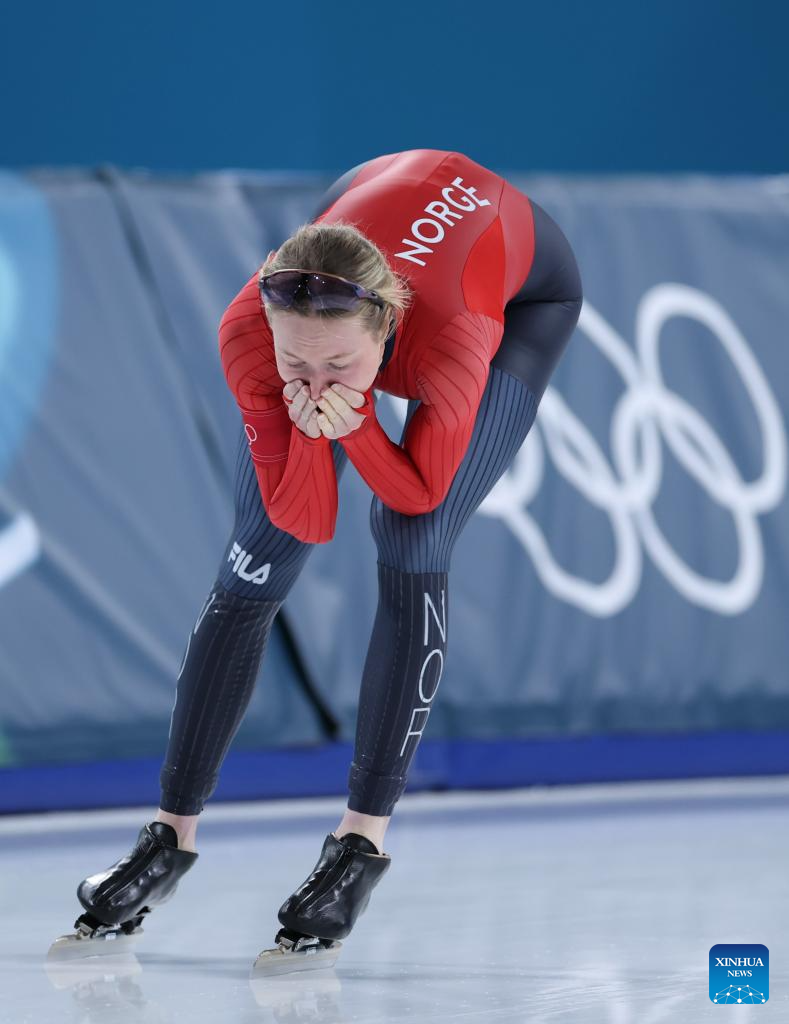 Ragne Wiklund of Norway reacts after the speed skating women's 5000m final at the Milan-Cortina 2026 Olympic Winter Games in Milan, Italy, Feb. 12, 2026. (Xinhua/Du Xiaoyi)