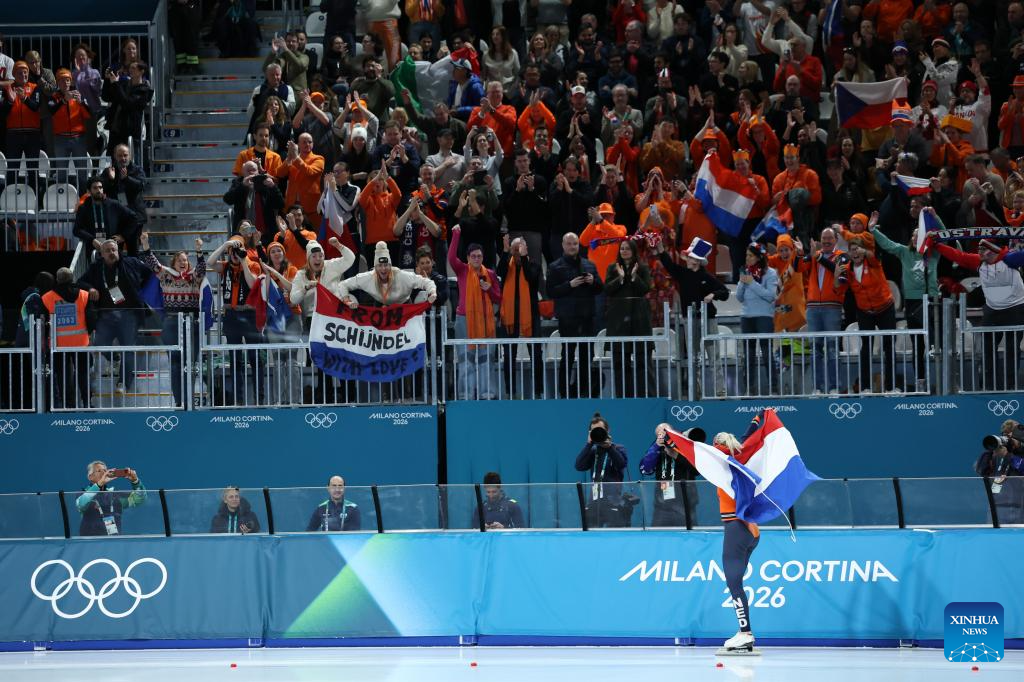 Merel Conijn of the Netherlands celebrates after the speed skating women's 5000m final at the Milan-Cortina 2026 Olympic Winter Games in Milan, Italy, Feb. 12, 2026. (Xinhua/Li Jing)
