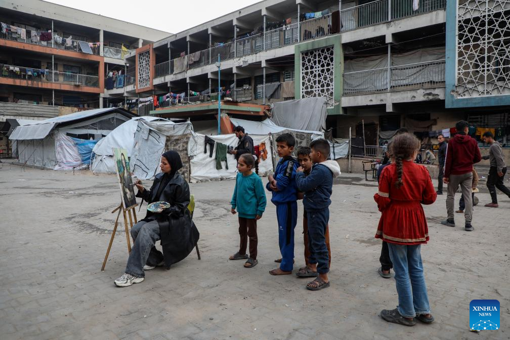 Palestinian artist Marah Al-Zaanin (1st L) draws a painting at a school-turned shelter in Gaza City, on Feb. 12, 2026. (Photo by Rizek Abdeljawad/Xinhua)
