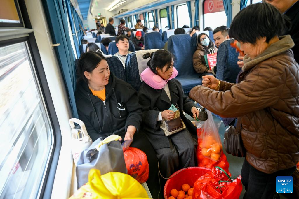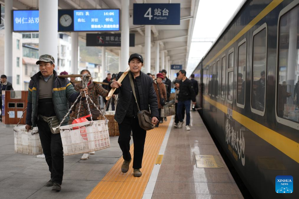 Farmers carrying goods for sale board the train No. 7272 bound for Tongren City, southwest China's Guizhou Province, Feb. 12, 2026.