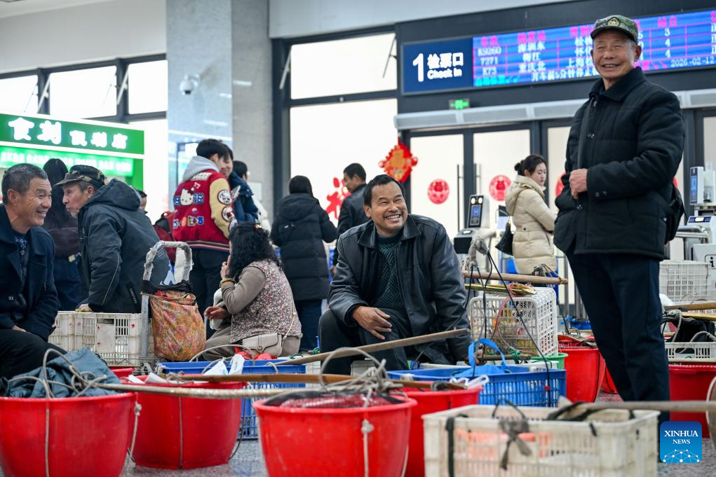 Villagers from Hunan Province talk at the Tongren Railway Station in Tongren City, southwest China's Guizhou Province, Feb. 12, 2026.