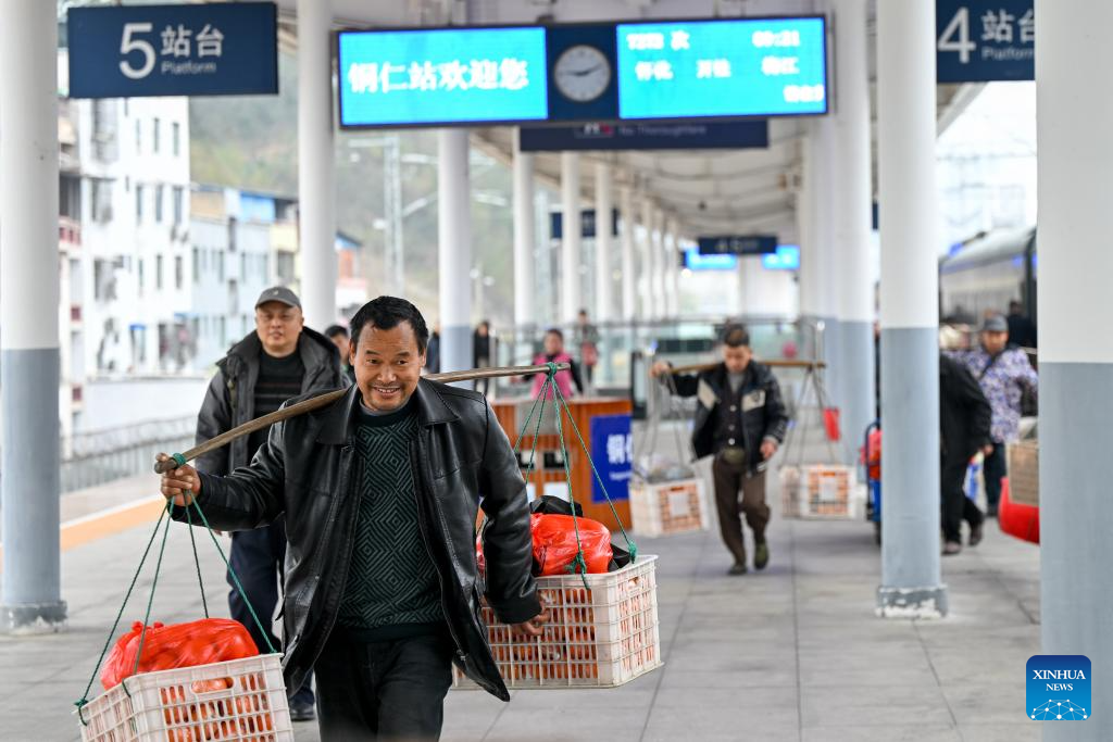 Villagers carrying goods for sale prepare to leave the Tongren Railway Station in Tongren City, southwest China's Guizhou Province, Feb. 12, 2026.