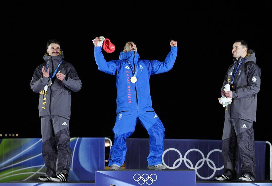 Matt Weston of Britain reacts after crossing the finish line during the skeleton men competition heat 4 at the Milan-Cortina 2026 Olympic Winter Games in Cortina, Italy, Feb. 13, 2026. (Xinhua/Ding Xu)Gold medalist Matt Weston of Britain jubilates on the podium after the skeleton men's competition at the Milan-Cortina 2026 Olympic Winter Games in Cortina, Italy, Feb. 13, 2026. (Xinhua/Lian Yi)■
