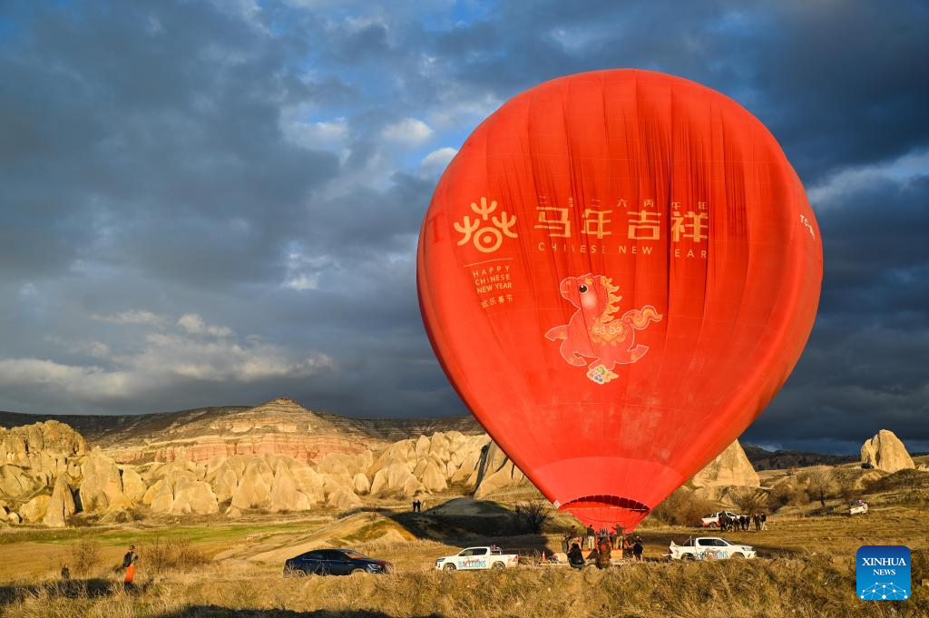 A hot air balloon themed on the Chinese Year of the Horse is inflated during a Chinese Spring Festival celebration in Cappadocia, Türkiye, Feb. 14, 2026. (Xinhua/Liu Lei)