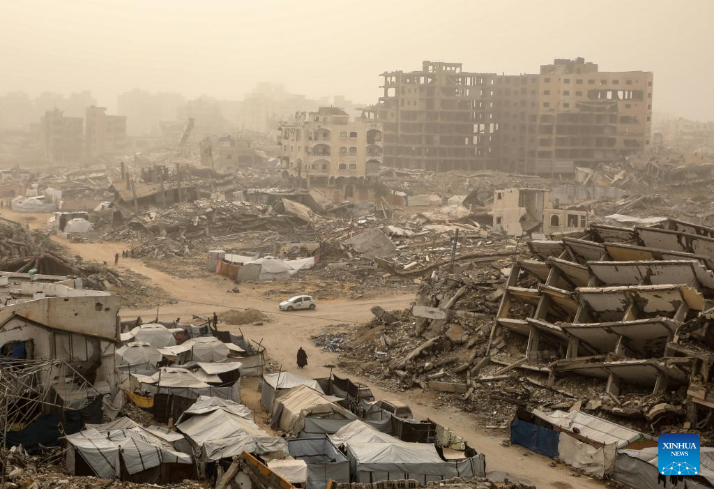 Palestinians walk among the rubble during a dust storm in southern Gaza City on Feb. 14, 2026. (Photo by Rizek Abdeljawad/Xinhua)