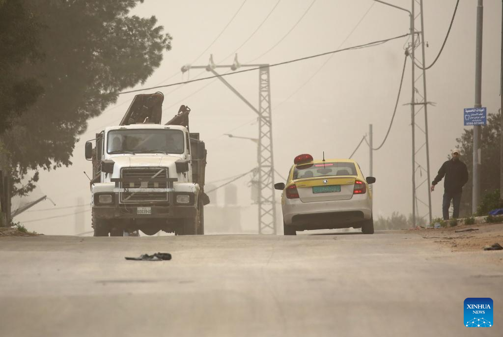 Vehicles are seen on a street during a dust storm in the West Bank city of Nablus on Feb. 14, 2026. (Photo by Nidal Eshtayeh/Xinhua)