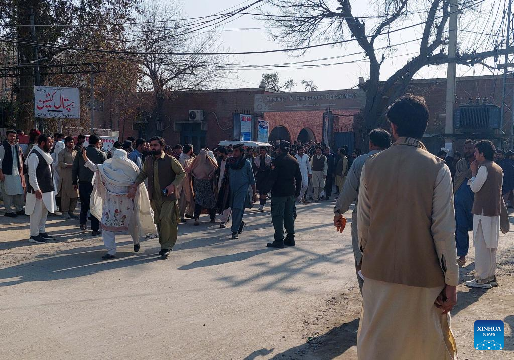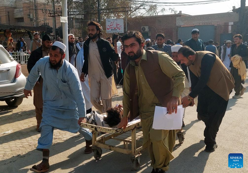 People transfer the injured to a hospital in Bannu district of Khyber Pakhtunkhwa province, Pakistan, Feb. 16, 2026. At least two people, including a child, were killed and several others injured in a blast in Pakistan's northwest Khyber Pakhtunkhwa province on Monday, police said. (Str/Xinhua)