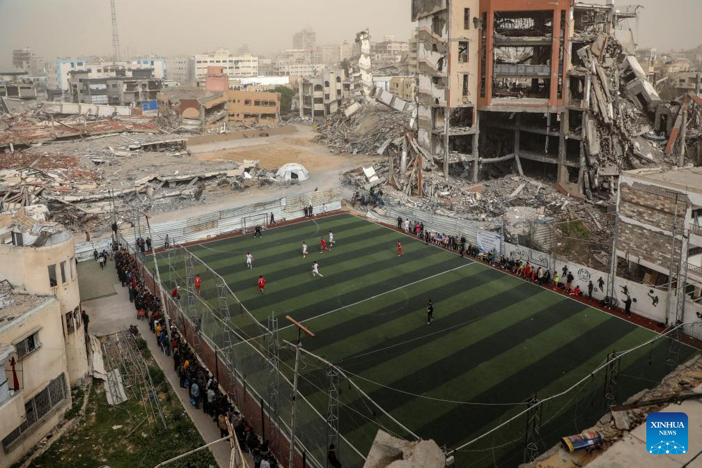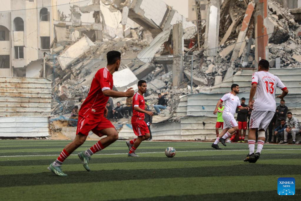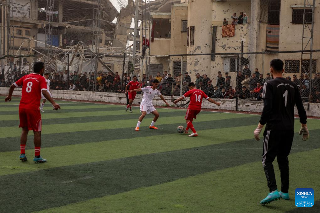 Palestinians participate in a football game in south Gaza City on Feb. 14, 2026. (Photo by Rizek Abdeljawad/Xinhua)