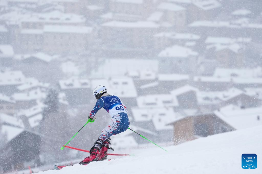 Chang Troy Samuel of Chinese Taipei competes during the alpine skiing men's slalom event at the Milan-Cortina 2026 Olympic Winter Games in Bormio, Italy, Feb. 16, 2026. (Xinhua/Hu Huhu)