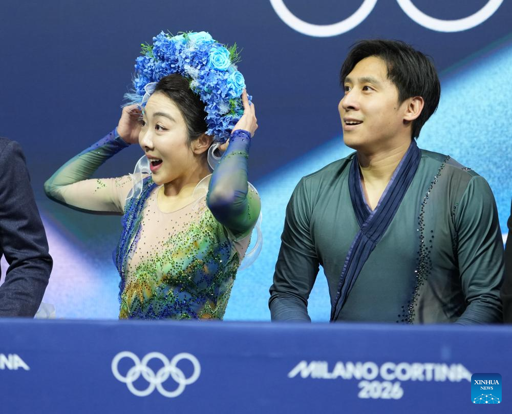 Sui Wenjing (L)/Han Cong of China wait for their score during the figure skating pair skating free skating match at the Milan-Cortina 2026 Olympic Winter Games in Milan, Italy, Feb. 16, 2026. (Xinhua/Xue Yuge)