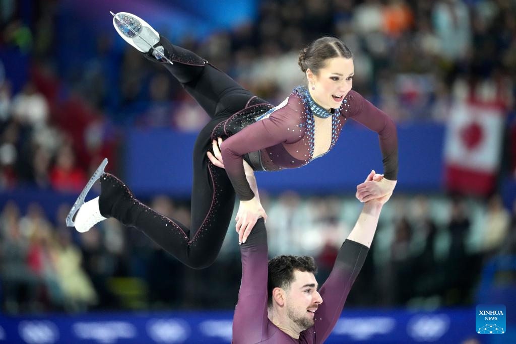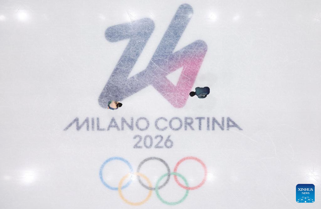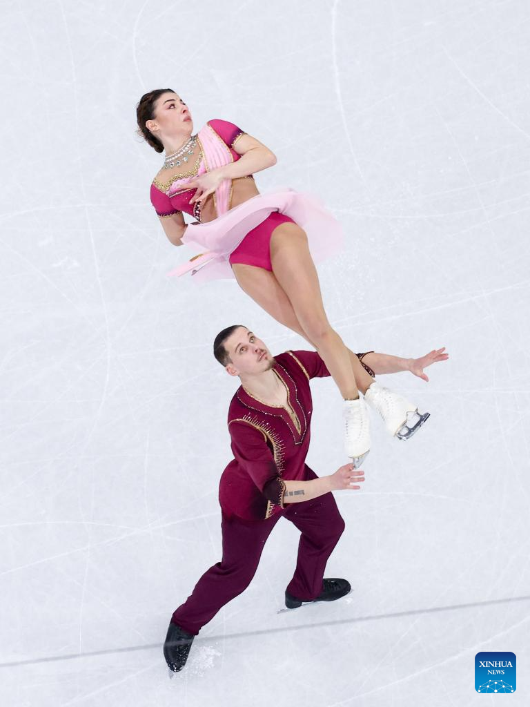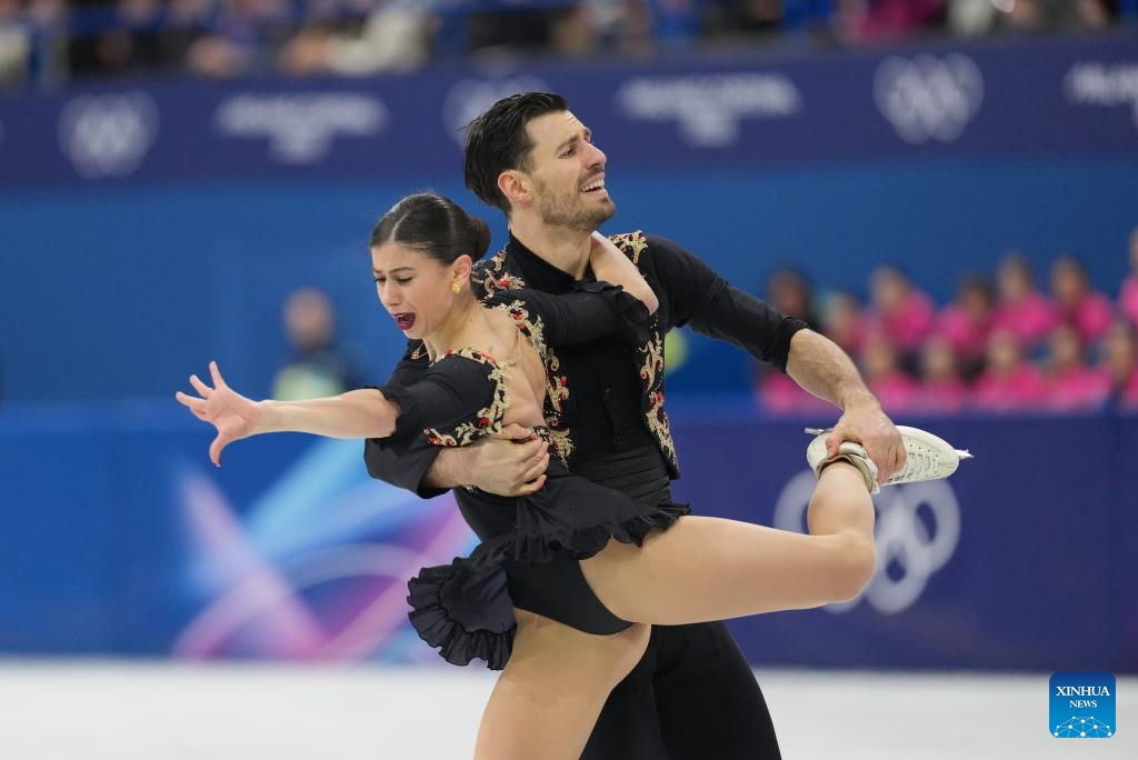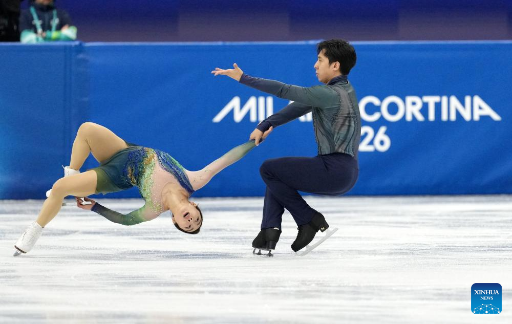 Rebecca Ghilardi (L)/Filippo Ambrosini of Italy compete during the figure skating pair skating free skating match at the Milan-Cortina 2026 Olympic Winter Games in Milan, Italy, Feb. 15, 2026. (Xinhua/Xue Yuge)