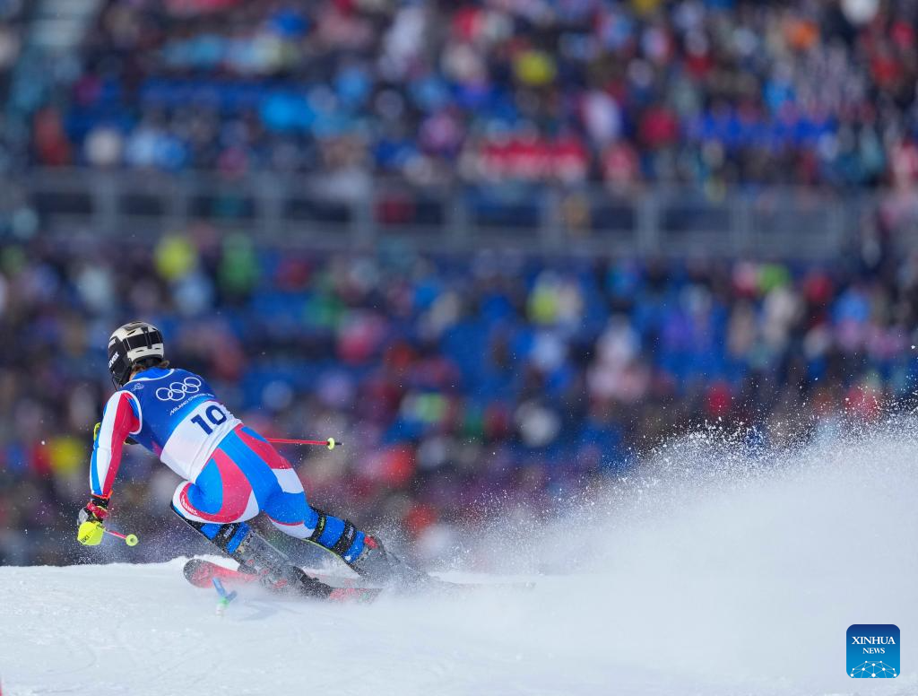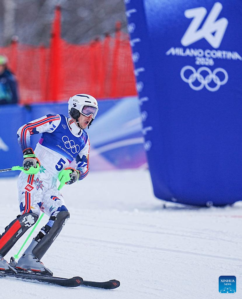 Steven Amiez of France competes during the alpine skiing men's slalom event at the Milan-Cortina 2026 Olympic Winter Games in Bormio, Italy, Feb. 16, 2026. (Xinhua/Hu Huhu)