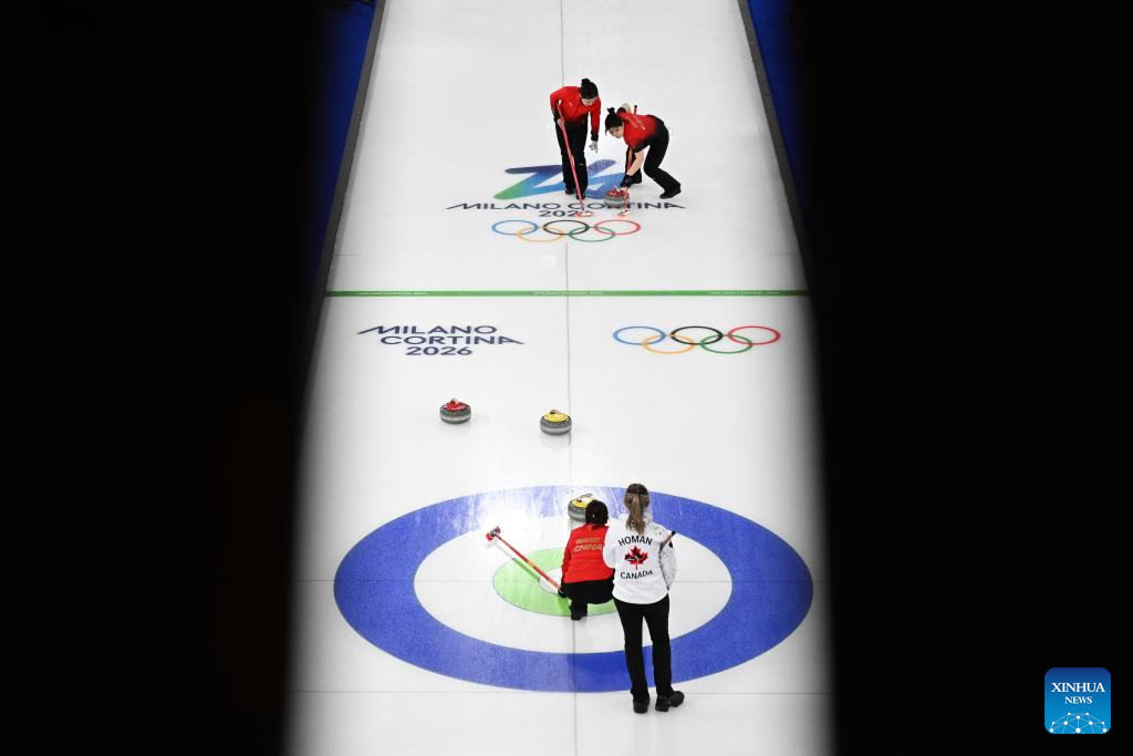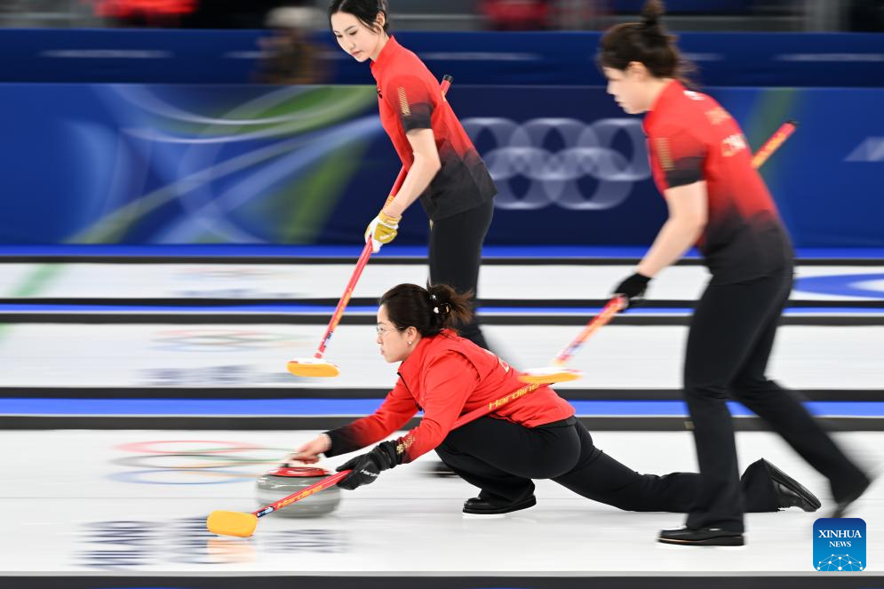 Wang Rui of China competes during the curling women round robin session 7 match between China and Canada at the 2026 Milan-Cortina Winter Olympics in Cortina, Italy, Feb. 16, 2026. (Xinhua/Lian Yi)
