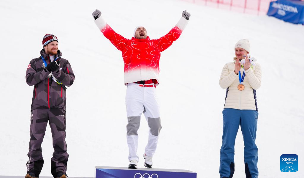 Gold medalist Loic Meillard (C) of Switzerland, silver medalist Fabio Gstrein (L) of Austria and bronze medalist Henrik Kristoffersen of Norway celebrate during the awarding ceremony of the alpine skiing men's slalom event at the Milan-Cortina 2026 Olympic Winter Games in Bormio, Italy, Feb. 16, 2026. (Xinhua/Yan Linyun)