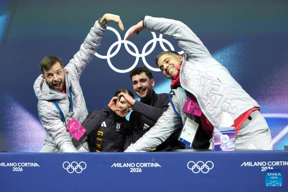 Annika Hocke (2nd L)/Robert Kunkel (2nd R) of Germany wait for their score during the figure skating pair skating free skating match at the Milan-Cortina 2026 Olympic Winter Games in Milan, Italy, Feb. 15, 2026. (Xinhua/Xue Yuge)