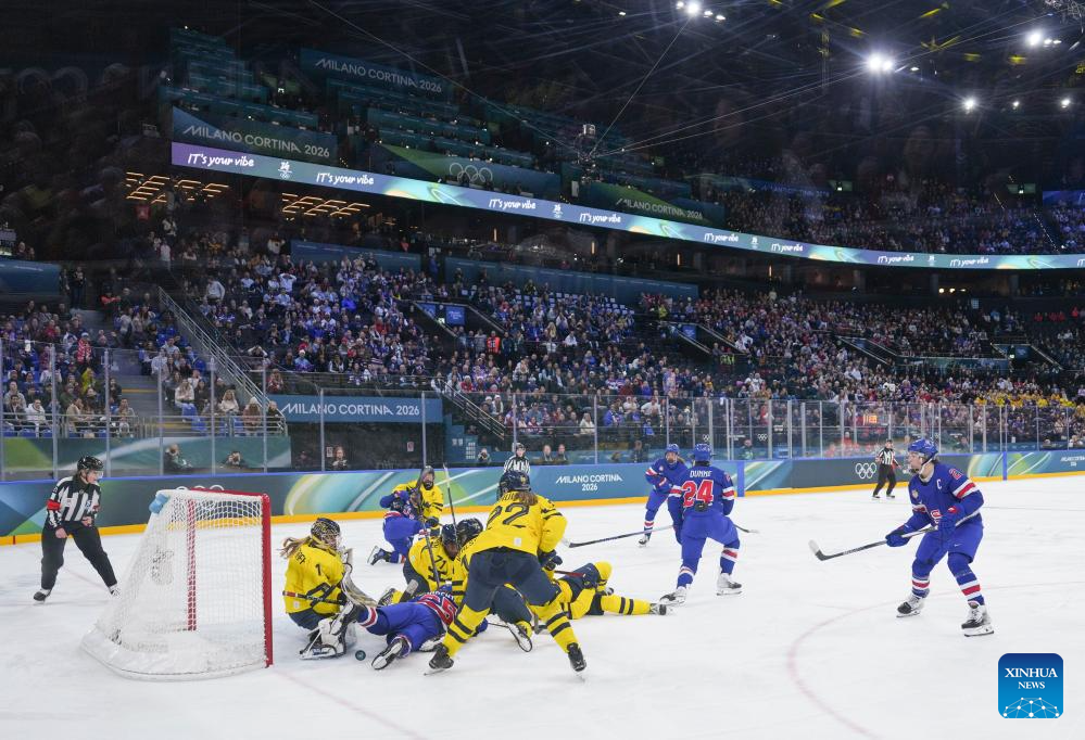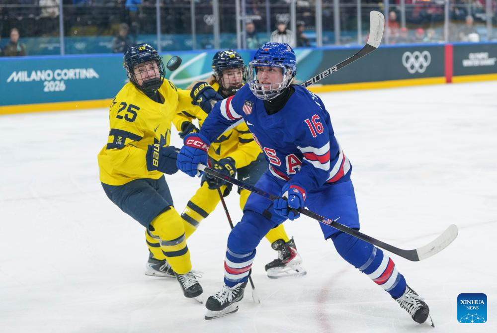 Players compete during the ice hockey women's play-offs semifinal between the United States and Sweden at the Milan-Cortina 2026 Olympic Winter Games in Milan, Italy, Feb. 16, 2026. (Xinhua/Sun Fei)