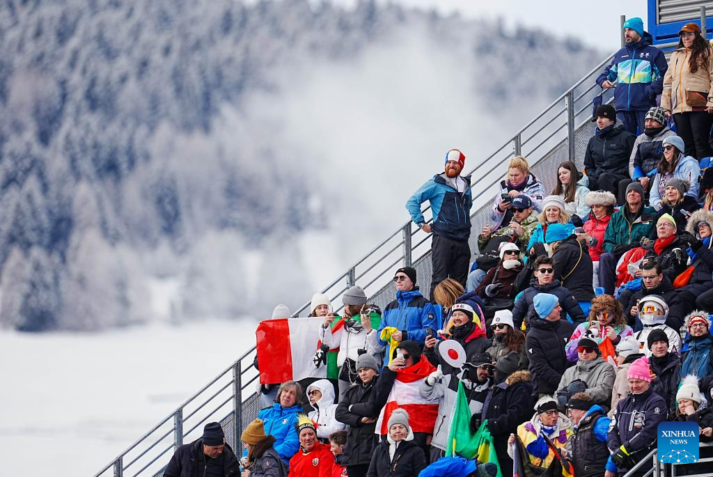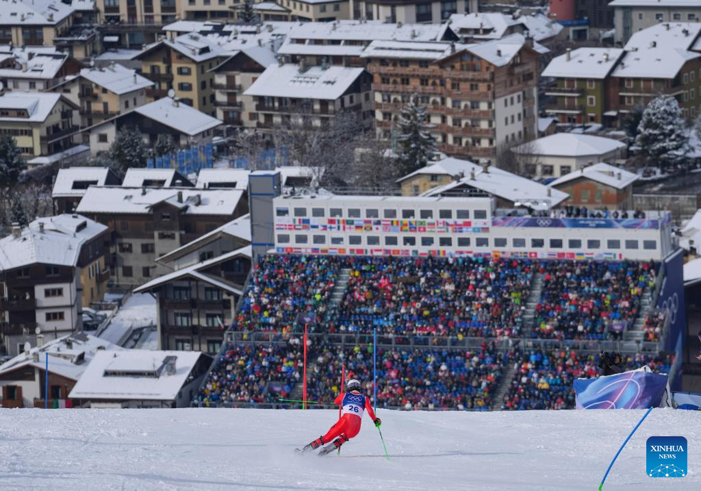 Spectators watch the alpine skiing men's slalom event at the Milan-Cortina 2026 Olympic Winter Games in Bormio, Italy, Feb. 16, 2026. (Xinhua/Yan Linyun)