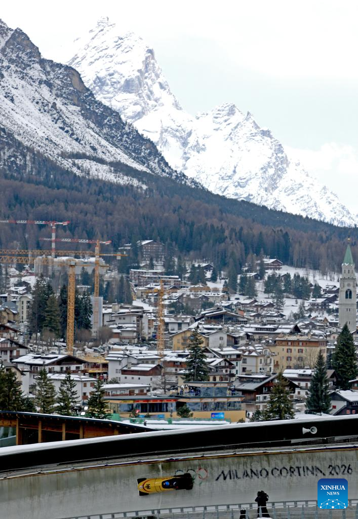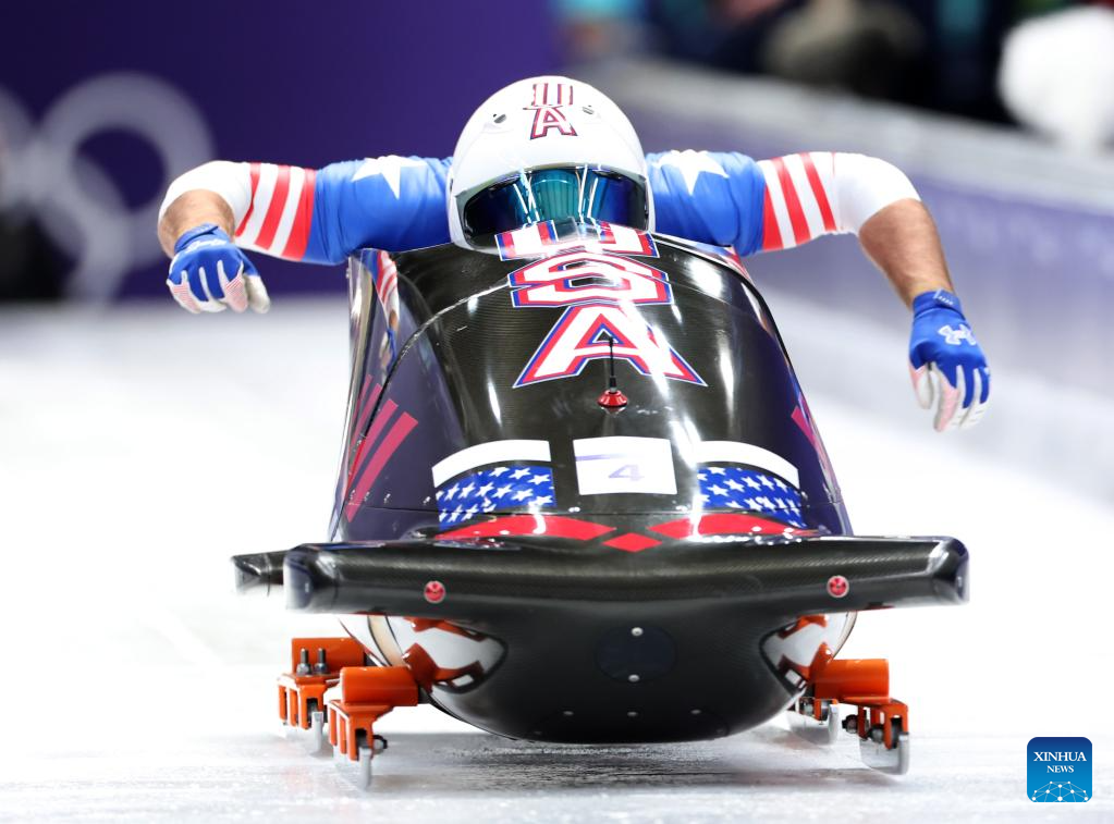 Frankie del Duca/Joshua Williamson of the United States compete during the bobsleigh 2-man heat 1 at the 2026 Milan-Cortina Winter Olympics in Cortina, Italy, Feb. 15, 2026. (Xinhua/Ding Xu)