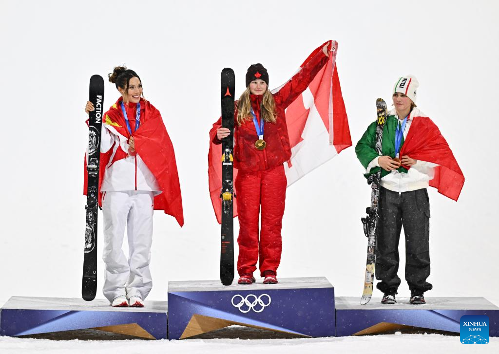 Gold medalist Megan Oldham of Canada celebrates during the awarding ceremony of the freestyle skiing women's freeski big air event at the Milan-Cortina 2026 Olympic Winter Games in Livigno, Italy, Feb. 16, 2026. (Xinhua/Hu Chao)