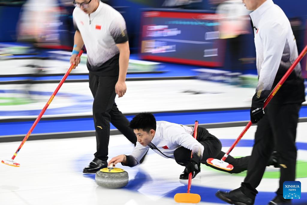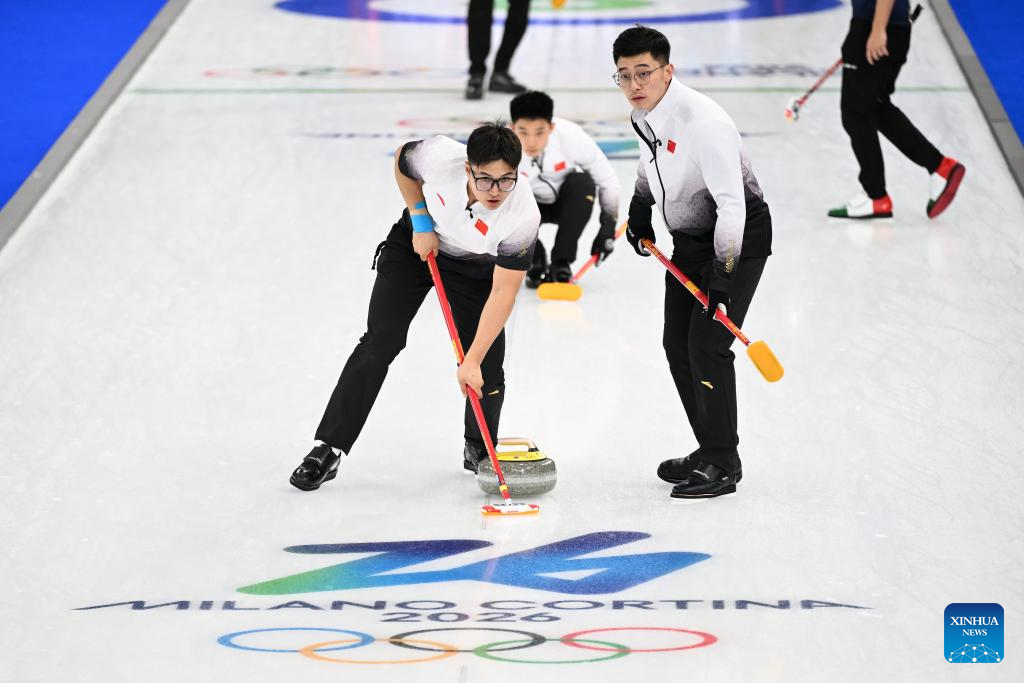 Fei Xueqing (bottom) of China competes during the curling men's round robin session 8 match between China and Italy at the 2026 Milan-Cortina Winter Olympics in Cortina, Italy, Feb. 16, 2026. (Xinhua/Lian Yi)