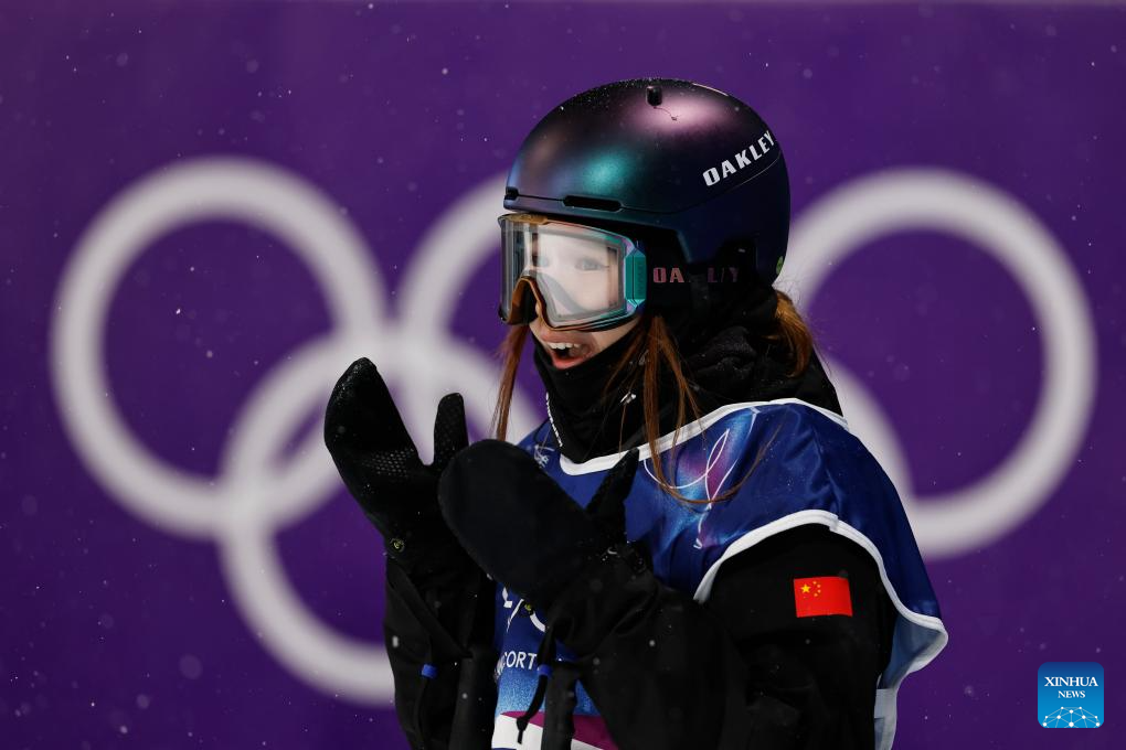 Gu Ailing of China is congratulated after the freestyle skiing women's freeski big air final at the Milan-Cortina 2026 Olympic Winter Games in Livigno, Italy, Feb. 16, 2026. (Xinhua/Zhang Hongxiang)