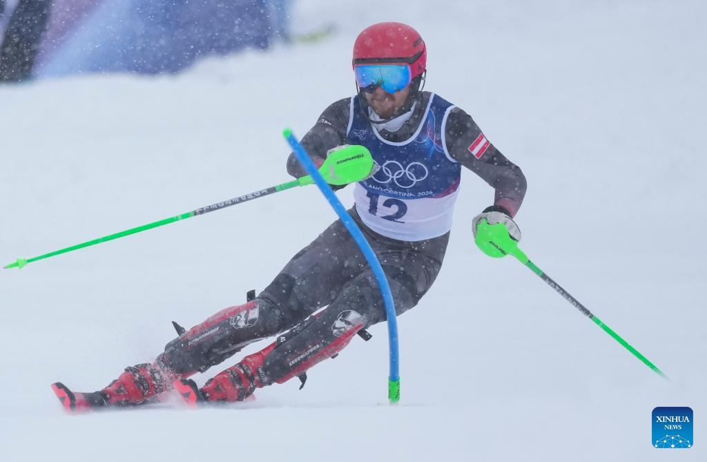 Fabio Gstrein of Austria competes during the alpine skiing men's slalom event at the Milan-Cortina 2026 Olympic Winter Games in Bormio, Italy, Feb. 16, 2026. (Xinhua/Hu Huhu)