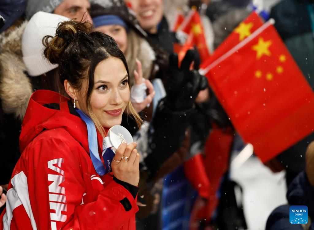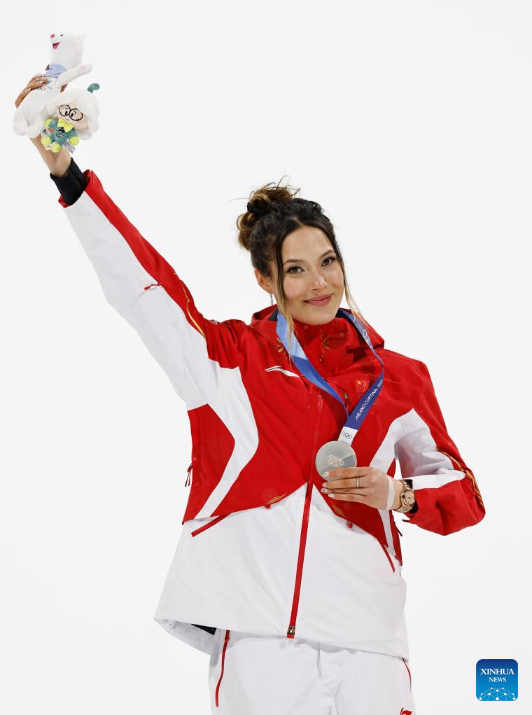 Silver medalist Gu Ailing of China poses for photos during the awarding ceremony of the freestyle skiing women's freeski big air event at the Milan-Cortina 2026 Olympic Winter Games in Livigno, Italy, Feb. 16, 2026. (Xinhua/Zhang Hongxiang)