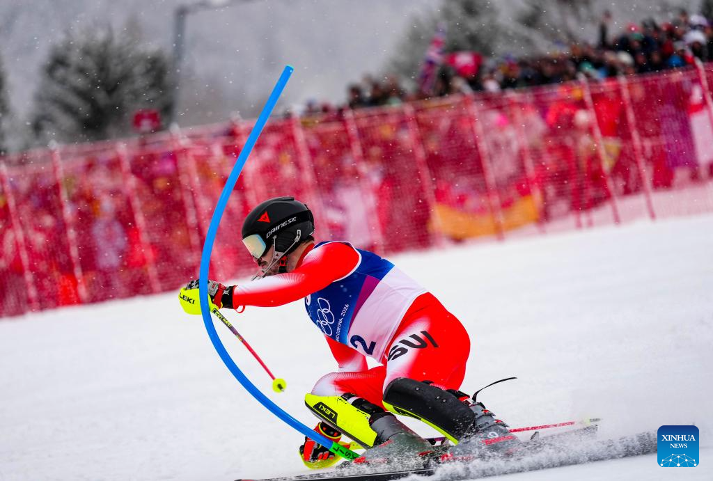 Matthias Iten of Switzerland competes during the alpine skiing men's slalom event at the Milan-Cortina 2026 Olympic Winter Games in Bormio, Italy, Feb. 16, 2026. (Xinhua/Hu Huhu)
