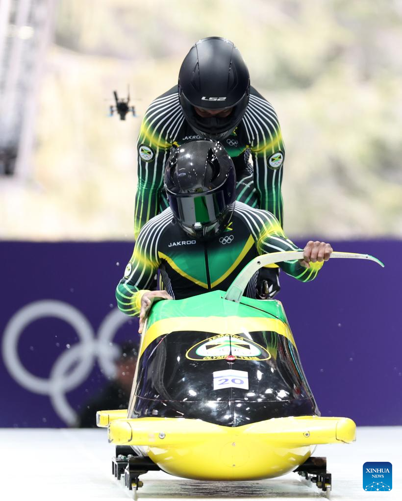 Shane Pitter/Junior Harris of Jamaica compete during the bobsleigh 2-man heat 1 at the 2026 Milan-Cortina Winter Olympics in Cortina, Italy, Feb. 15, 2026. (Xinhua/Ding Xu)