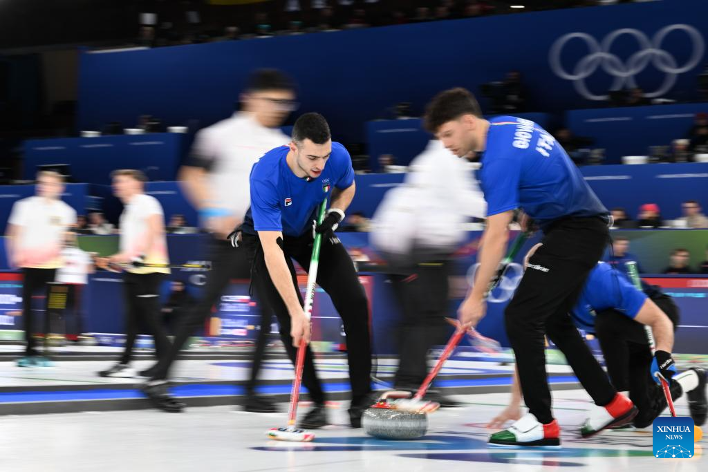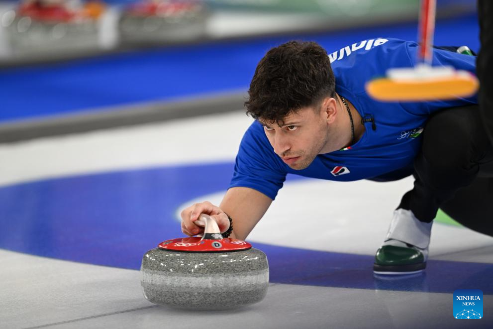 Mattia Giovanella of Italy competes during the curling men's round robin session 8 match between China and Italy at the 2026 Milan-Cortina Winter Olympics in Cortina, Italy, Feb. 16, 2026. (Xinhua/Lian Yi)