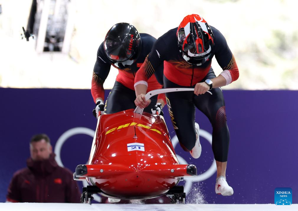 Li Chunjian/Ye Jielong of China compete during the bobsleigh 2-man heat 1 at the 2026 Milan-Cortina Winter Olympics in Cortina, Italy, Feb. 15, 2026. (Xinhua/Ding Xu)pagebreak