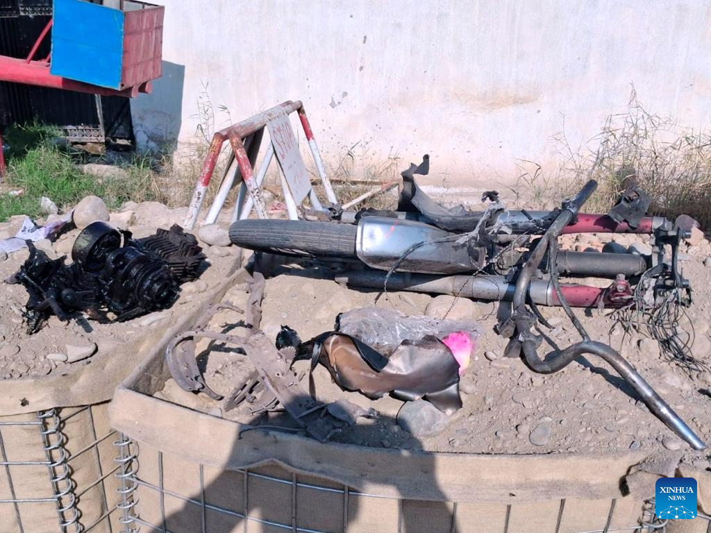 This photo taken on Feb. 16, 2026 with a mobile phone shows a destroyed motorbike at the blast site in Bannu district of Khyber Pakhtunkhwa province, Pakistan. At least two people, including a child, were killed and 12 others injured in a blast in Pakistan's northwest Khyber Pakhtunkhwa province on Monday, authorities said. The explosion took place in front of the main gate of Miryan Police Station in Bannu district at around 10 a.m. local time, a local police official told Xinhua. (Str/Xinhua)