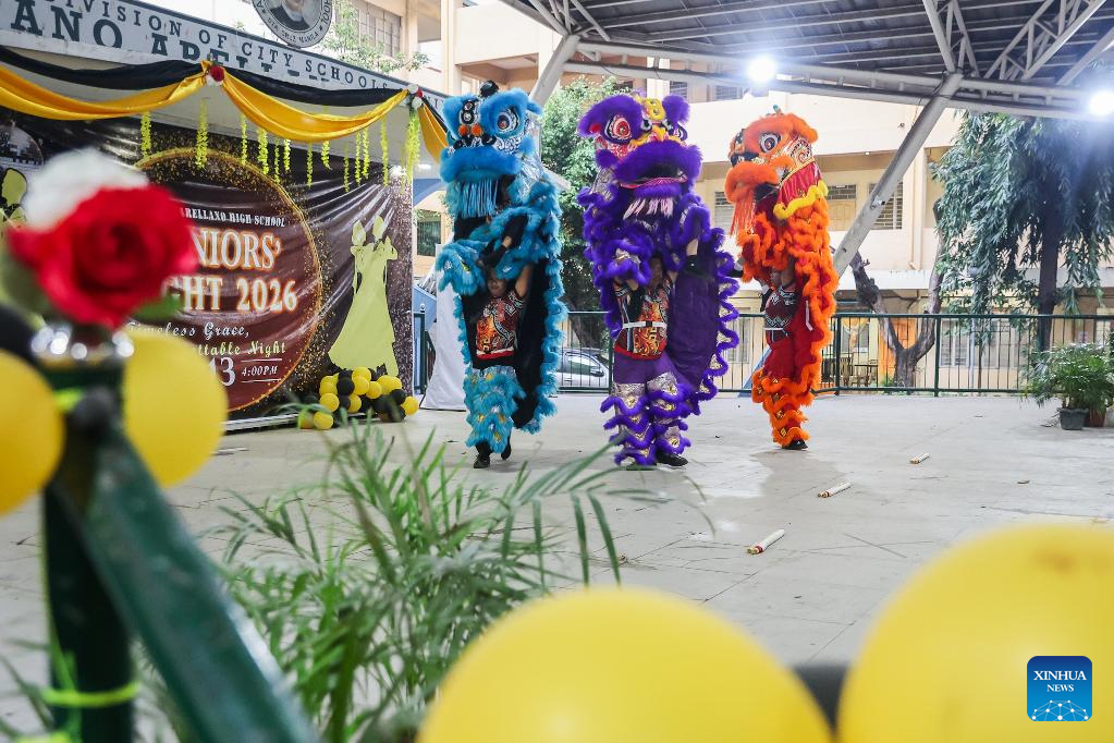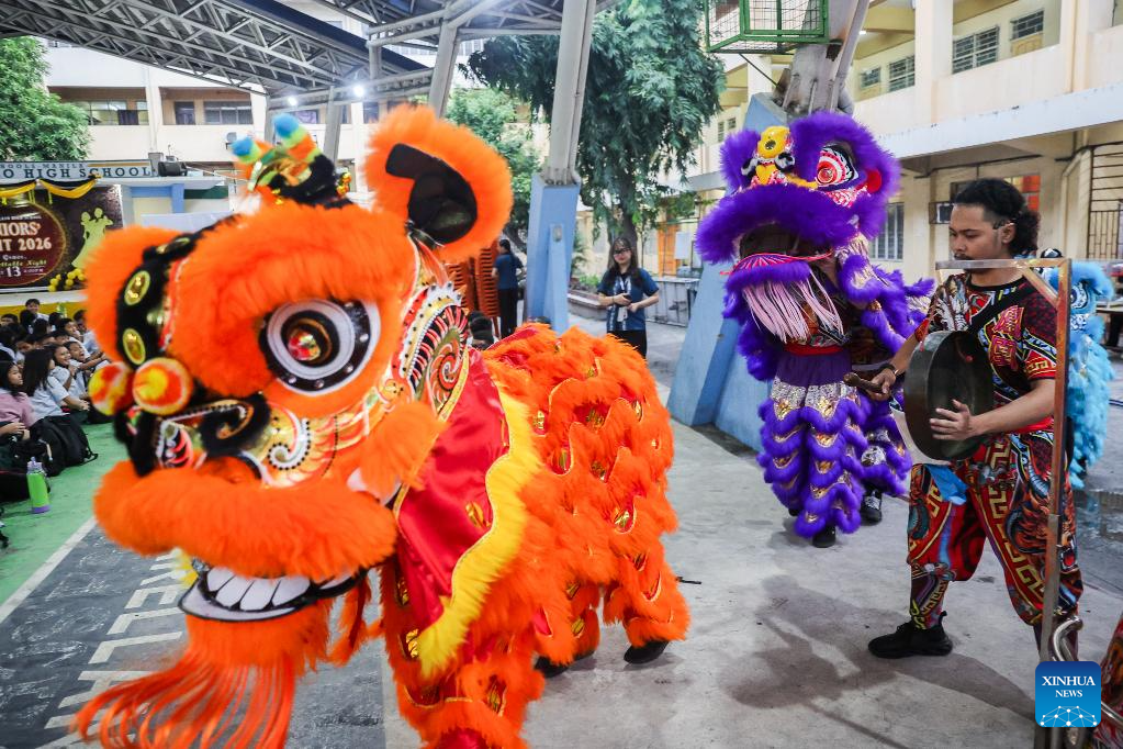 People perform lion dance at a school in celebration of the Lunar New Year in Manila, the Philippines, Feb. 16, 2026. (Xinhua/Rouelle Umali)