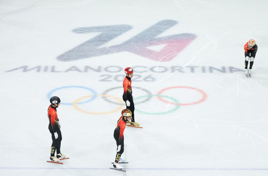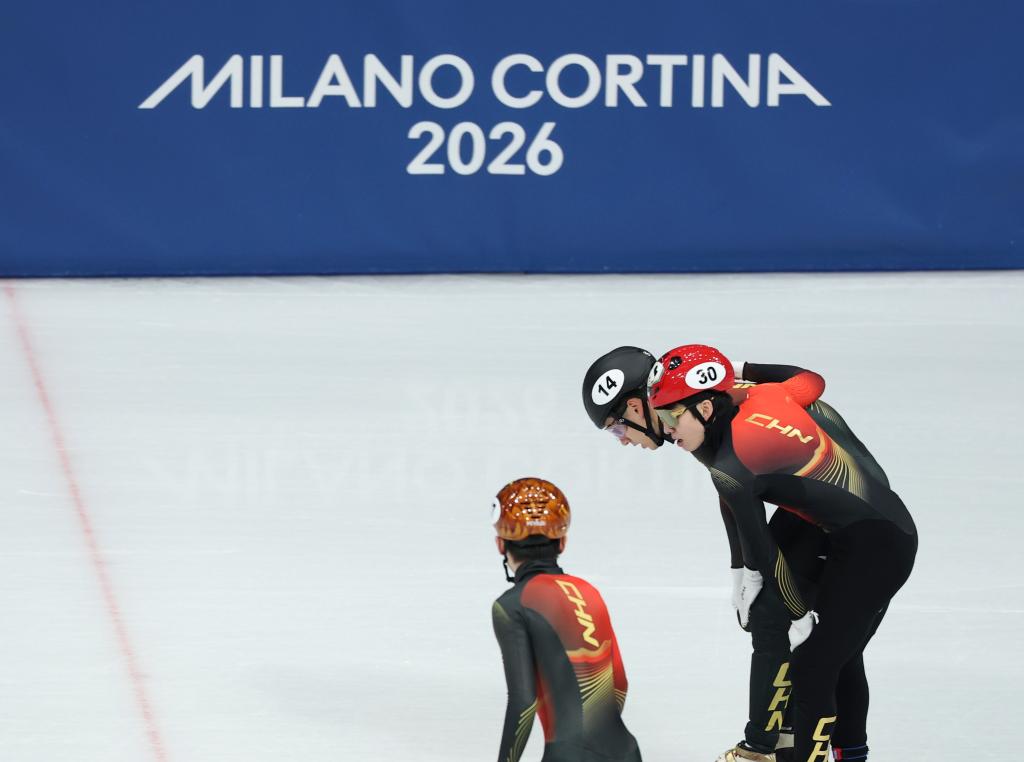 Liu Shaoang (1st L), Zhang Bohao (2nd L), Lin Xiaojun (2nd R) and Li Wenlong of China react after the short track speed skating men's 5000m relay semifinal at the Milan-Cortina 2026 Olympic Winter Games in Milan, Italy, Feb. 16, 2026. (Xinhua/Li Ming)Liu Shaoang (C), Zhang Bohao (L) and Lin Xiaojun of China react after the short track speed skating men's 5000m relay semifinal at the Milan-Cortina 2026 Olympic Winter Games in Milan, Italy, Feb. 16, 2026. (Xinhua/Li Ming)