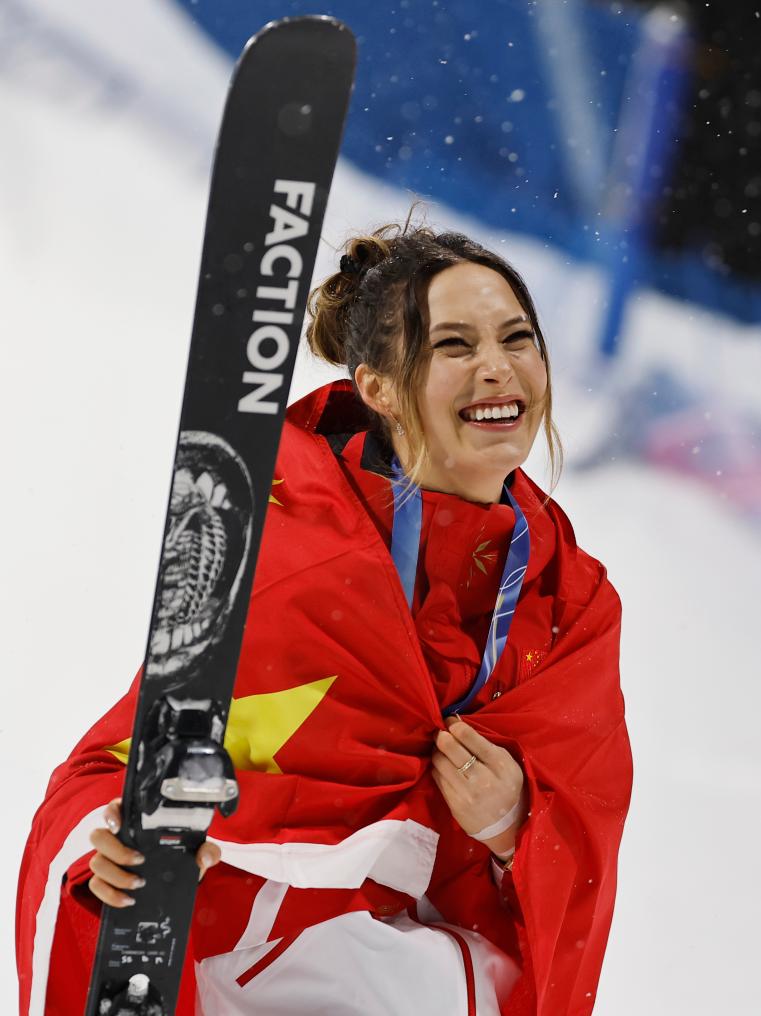 Gu Ailing of China celebrates during the freestyle skiing women's freeski big air event at the Milan-Cortina 2026 Olympic Winter Games in Livigno, Italy, Feb. 16, 2026. (Xinhua/Zhang Hongxiang)Gu Ailing of China is congratulated after the freestyle skiing women's freeski big air final at the Milan-Cortina 2026 Olympic Winter Games in Livigno, Italy, Feb. 16, 2026. (Xinhua/Zhang Hongxiang)