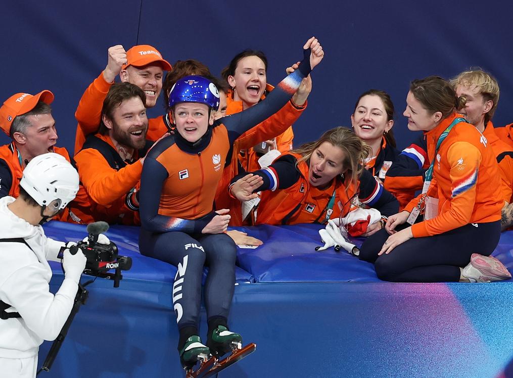 Xandra Velzeboer (front) of the Netherlands celebrates after the short track speed skating women's 1000m final A at the Milan-Cortina 2026 Olympic Winter Games in Milan, Italy, Feb. 16, 2026. (Xinhua/Li Ming)