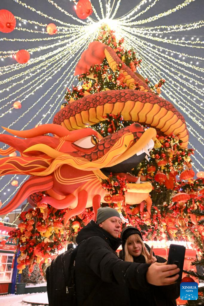 Visitors take selfies in front of decorations in celebration of the Chinese New Year in Moscow, Russia, Feb. 16, 2026. (Xinhua/Hao Jianwei)